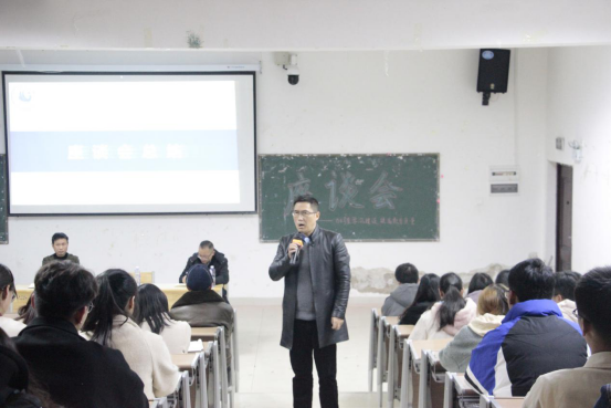 赵少平针对学院学风建设发表了讲话,围绕“学风、班风、教风”展开教育话题,根据教育部印发的《关于深化本科教育教学改革全面提高人才培养质量的意见》提出“学生忙起来、教师强起来、管理严起来、效果实起来”的系统部署要求全面提升本科教育教学。然而受疫情影响,本学期同学们的学习积极性有所下滑、学习效率有所降低,整体学风亟待改善。需要同学们树立正确的学习动机,端正学习态度,主动与老师交流学习,提高学习积极性,抓学风同时学院狠抓教风,“双管齐下”,共同提高学院教育质量。各班应积极开展关于学风、班风的主题班会,各辅导员与班主任也应参与其中,推动班会有序开展,形成有凝聚力的班风。在答疑环节中,同学们从教学任务的安排、课堂组织形式、大一新生的“养成教育”、自修室安排等方面积极提问,现场氛围活跃,学生们情绪高涨,师生之间的讨论愈发地热烈,呈现了一幅融洽又不失严肃的景象。这不仅有效地解决了学生在学习和生活中遇到的问题,更增进了师生之间的情感。最后赵少平对此次座谈会总结讲话,通过座谈所了解的问题学院会高度关注,做好同学教育和服务工作,同时希望学生克服当下困难,努力学习,形成优良的学风。