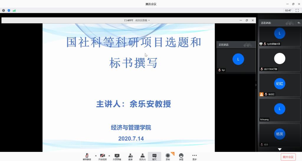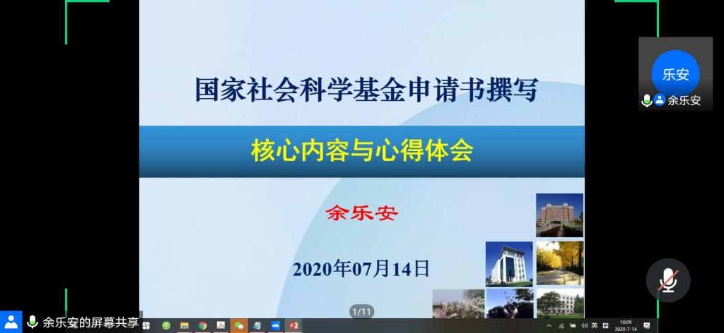 为进一步提高我院教师科研能力,帮助工商管理应用特色学科学术骨干更好地进行科研项目申报及标书撰写,7月14日上午,国家杰出青年科学基金获得者、北京化工大学余乐安教授以腾讯会议的形式为工商管理应用特色学科学术骨干开展讲座,我院教师采用线上线下相结合的方式进行聆听与探讨。讲座由经管学院院长赵少平主持,副校长刘俊学、副院长朱纪红、工商管理应用特色学科团队成员参加了此次讲座。