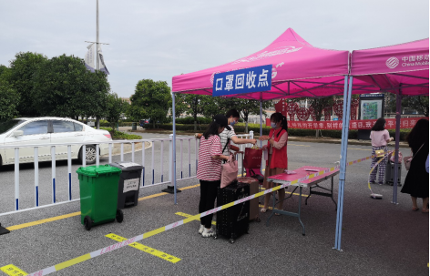 党员志愿者们在对学生的旧口罩进行回收、消杀,并发放新口罩
