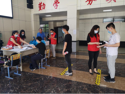 党员志愿者们在为学生登记报到、发放物资、测量体温