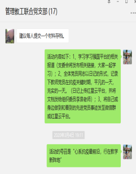 学院党支部积极响应并带头落实各项防控部署要求,通过“学习强国”音(视)频会议、腾讯会议、QQ音(视)频会议等形式开展主题党日活动,各党支部书记组织全体师生党员学习了《习近平在统筹推进新冠肺炎疫情防控和经济社会发展工作部署会议上的讲话》、《关于加强党的领导、为打赢疫情防控阻击战提供坚强政治保证的通知》和学校下发《关于在疫情防控期间做好党建工作的通知》文件。