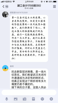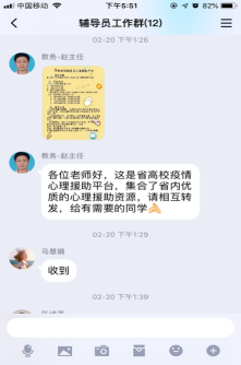 依托湖南省教育厅建立的湖南省高校疫情心理援助平台、开元集团网站开通的心理援助在线服务,我院辅导员24小时在线辅导,利用工作群、班级群等线上平台传递关心、传播正能量,为大家打造多条有效的“心理疏导”通道。确保学生心声有处可诉,有人倾听。