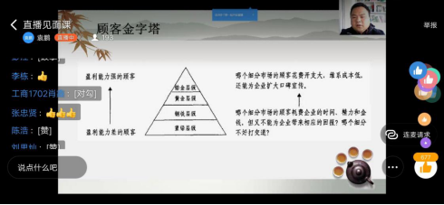 本次示范课,袁鹏老师主要讲解了识别客户和客户识别与分类管理两大内容,并详细介绍了相关概念、模型等理论知识点;企业老师应萧霞以《客户的识别与分类管理及其案例分析》为题开展了讲解,针对“为什么要进行客户分类”这一问题与同学们讨论。然后企业老师结合自己的实践工作为同学们分析了经典案例,并强调了理论与实践相结合的重要性。示范课设置了提问讨论环节,同学们通过线上群聊的方式积极提问,老师耐心讲解,课堂学习氛围浓厚。