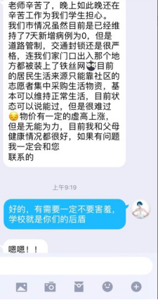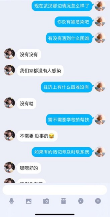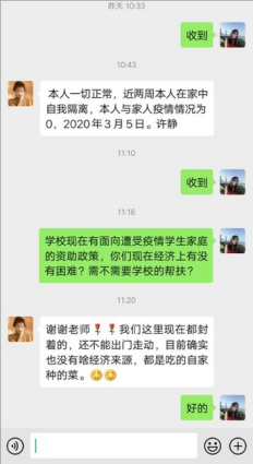 对于来自疫情爆发区域的家庭经济困难学生,学院积极开展心理疏导、情感关怀等措施,密切关注家庭经济困难学生的心理状况,通过微信、QQ、电话等及时了解他们在家学习生活及抗疫防护情况,对学生进行全方位的关爱帮扶,使他们在疫情期间能安心学习、健康成长。
