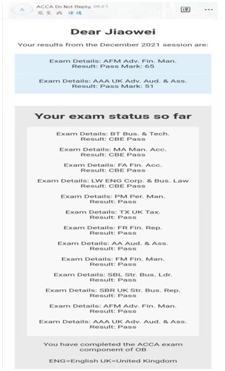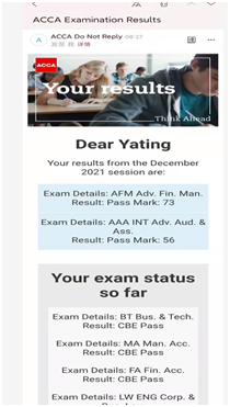 在学院领导和专业老师的引导下,ACCA教学班各年级学生都认真做好大学规划和未来职业生涯规划,主动给自己加压,如2020级欧阳昆霖、黄伟洁、李果、陈若琳等10余名同学以及2019级李裕琳、吴芷怡、刘诗妍、洪涔瑜等同学均刻苦学习、积极备考,提前通过ACCA多门课程的全球统考。2020级优秀学子欧阳昆霖紧跟优秀学长学姐脚步,已经通过了六门课程考试(其中2门提前通过),决心大二结束时提前通过F阶段的全部课程,充分展现了ACCA教学班优良的学风和ACCA学子“立大志、成大才、担大任”的决心和勇气。
