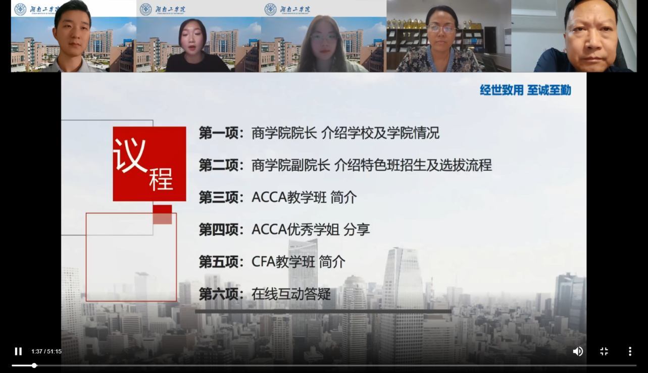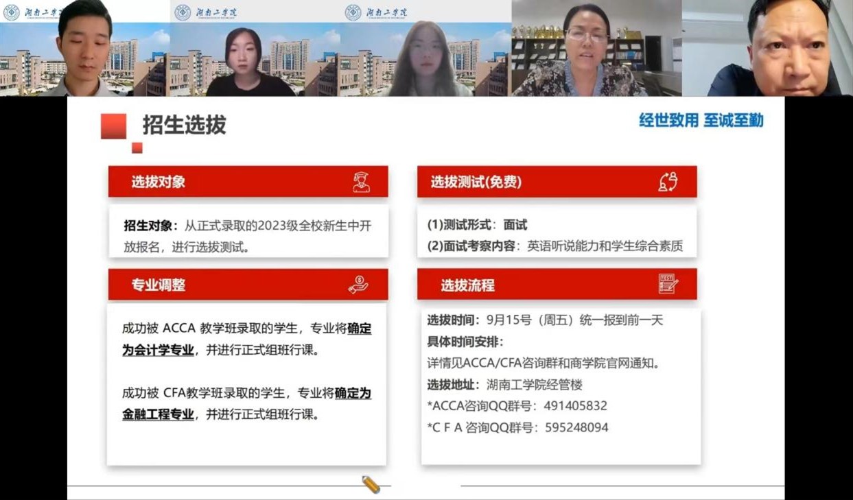 8月26日,商学院召开“2023级新生线上见面会暨国际项目班宣讲会”,商学院院长王小兵、副院长朱纪红、ACCA兼CFA国际项目班唐力翱老师及2023级班助彭苗、唐诗怡,商学院2023级新生及家长线上参会。会议由唐诗怡主持。