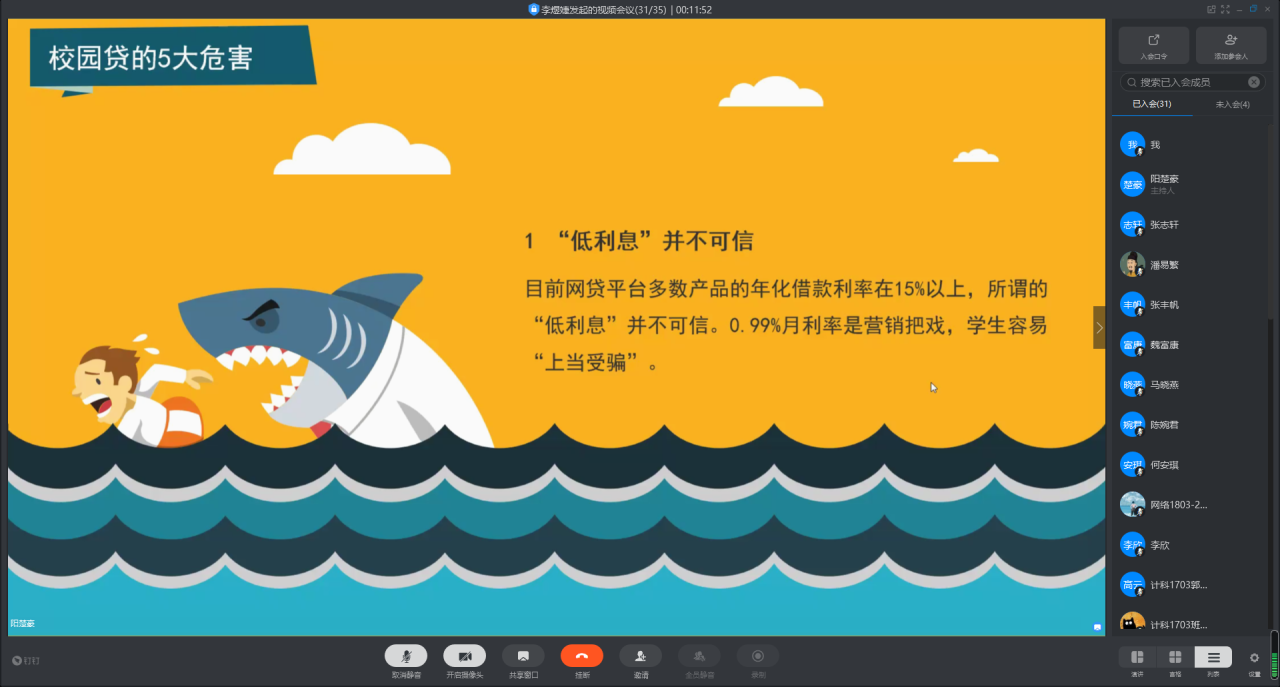 会议主持人带领大家一起了解了防范非法集资知识。首先就对什么是校园贷的基本常识作出讲解,包括电商平台,金融公司,网贷平台,线下私贷,银行机构等。紧接着对校园贷的5大危害进行讲解,其危害包括“低利息”不可信;越便捷,越易变“劫”;一旦逾期,催款“全方位”;易滋生恶习。最后主持人就如何拒绝校园贷,做出重要讲解,并播放了防范非法集资知识宣传短视频来提醒同学远离校园贷。
