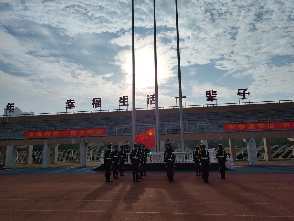 晨光中,英姿飒爽的国旗护卫队踏着整齐划一、铿锵有力的步伐护送五星红旗走向升旗台,伴随着庄严的国歌,五星红旗冉冉升起,在熠熠晨光中迎风飘扬,全体师生行注目礼,深怀对祖国无限的热爱和崇高的敬意。