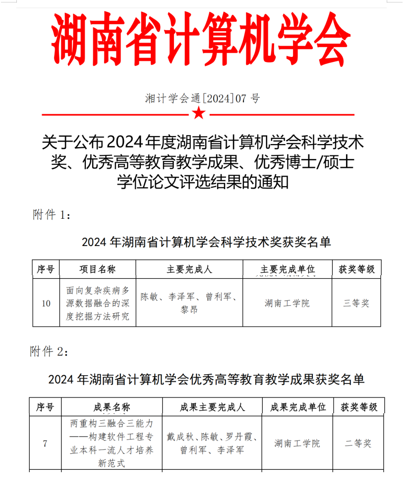 近日,湖南省计算机学会2024年优秀高等教育教学成果奖、科学技术奖评选结果揭晓,开元官网计算机科学与工程学院两项成果喜获殊荣。其中,生物医学大数据智能挖掘及应用科研团队主持申报的《面向复杂疾病多源数据融合的深度挖掘方法研究》喜获科学技术奖三等奖,PBL教学团队主持申报的《两重构三融合三能力——构建软件工程专业本科一流人才培养新范式》喜获优秀高等教育教学成果奖二等奖。
