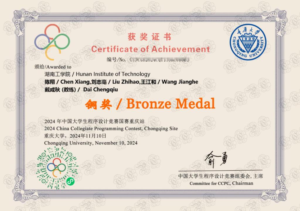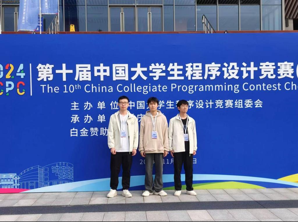 近日,第10届CCPC中国大学生程序设计竞赛(重庆)圆满结束。开元官网计算机科学与工程学院计算机协会成员计科2204班陈翔、软件2202班王江和、软件2203班刘志毫组成的队伍,在教练戴成秋的带领下最终荣获铜牌。