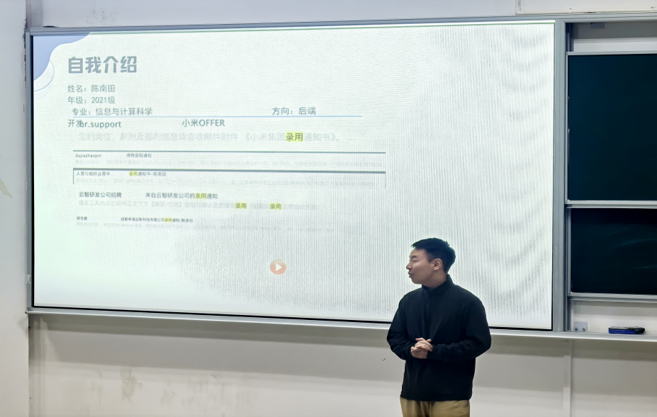 陈南田以其大学期间的学习过程及求职经历为主线,用“2000份简历”的故事生动再现了他面对挑战、克服困难直至成功入职字节跳动的奋斗历程。同时鼓励学生们珍惜校园时光,充分利用学校提供的资源,提升自己的能力和素质。学生们对专业领域有了更加深刻的认识,明确了学习方向和学习目标,受益匪浅。