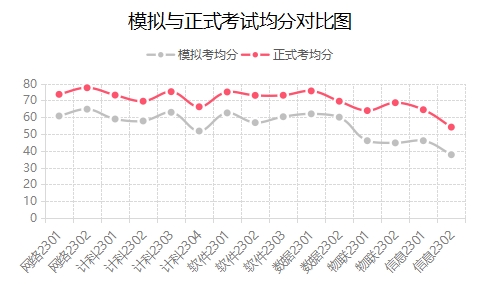 2024年1月10日星期三,《C语言程序设计》期末考试如期而至,正式考试每个考场安排了2位监考教师,监考更严,秩序更好,所有题目按知识点随机抽题,选项以及出现顺序均为乱序,考核公平性得到了良好保证。考试结束后,系统自动评阅客观题、函数题与编程题,学生即刻可以看到自己的考试成绩,感受一分付出一分收获。相比于模拟考试,班级平均分得到了明显提升,具体如下图所示。