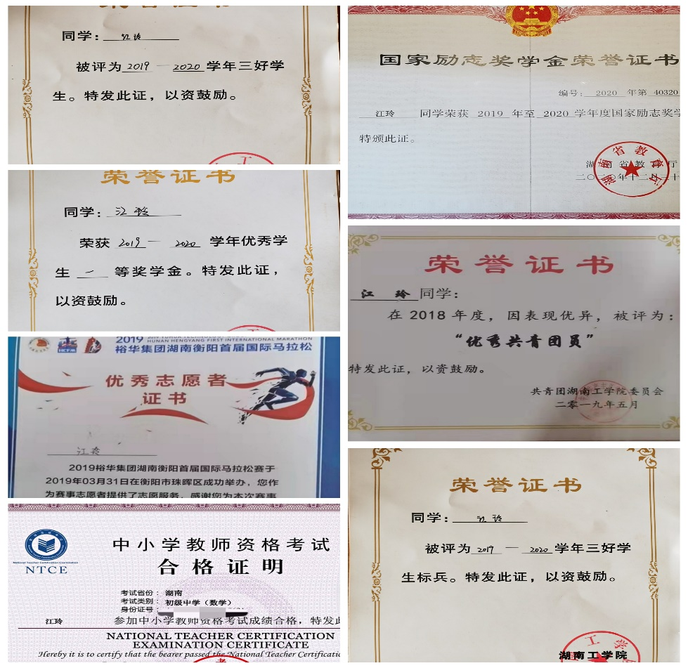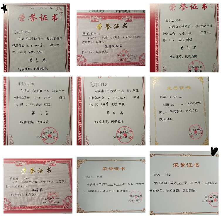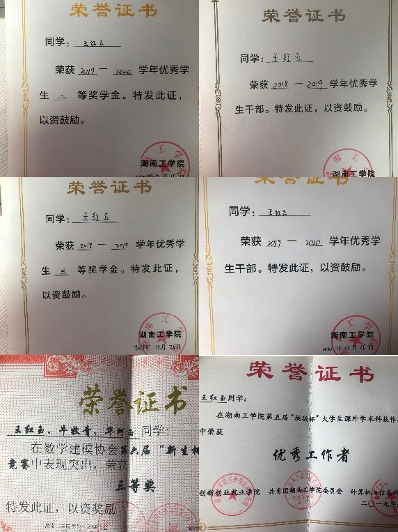 在校期间荣获国家励志奖学金3次、校级一等奖学金2次、校二等奖学金1次、校三好学生3次、校三好学生标兵1次、校优秀共青团员1次,校优秀学生干部1次;多次参加学校组织的公益活动,在衡阳市首届国际马拉松比赛中获“优秀志愿者”。
