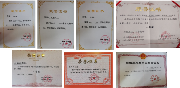 在校期间获得国家励志奖学金、校级优秀学生二等奖学金三次、校级三好学生、优秀共青团员、优秀学员、一校一书征文三等奖、优秀工作者、科技文化节二等奖、衡阳市优秀志愿者等荣誉。