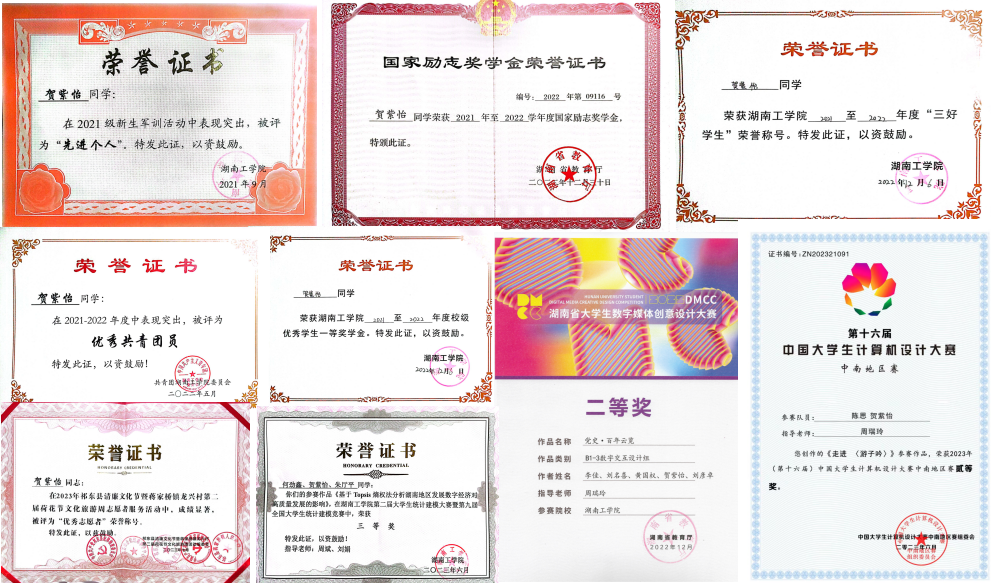 在校期间多次获得省、校级荣誉,荣获国家奖学金1次、国家励志奖学金1次、校级一等奖学金2次、校级“三好学生”称号2次、校级优秀共青团员1次,优秀共青团干部1次。曾参加湖南省大学生数字媒体创意设计大赛省级二等奖与第十六届中国大学生计算机设计大赛获中南赛区二等奖,在校期间积极参与志愿活动,被评为县级“优秀志愿者”。