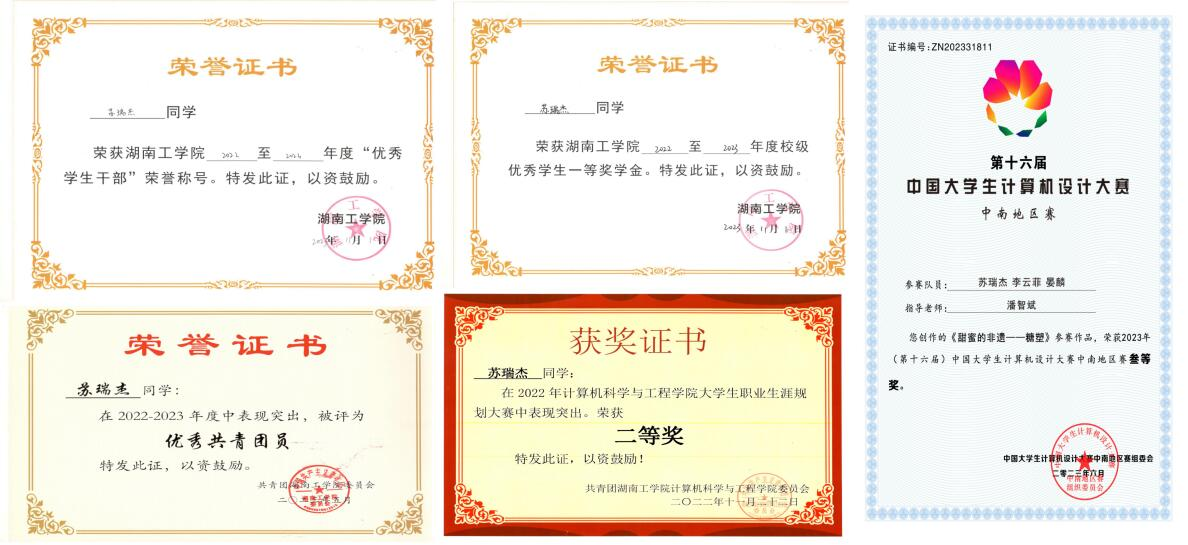 在校期间荣获国家励志奖学金1次、校级一等奖学金1次、校级优秀学生干部1次、校级优秀共青团员1次、优秀班干部1次,综合成绩排名专业第一。曾参加第十六届中国大学生计算机设计大赛获中南赛区三等奖,在学院工作期间,热心服务同学,荣获团委学生会“优秀工作者”称号。