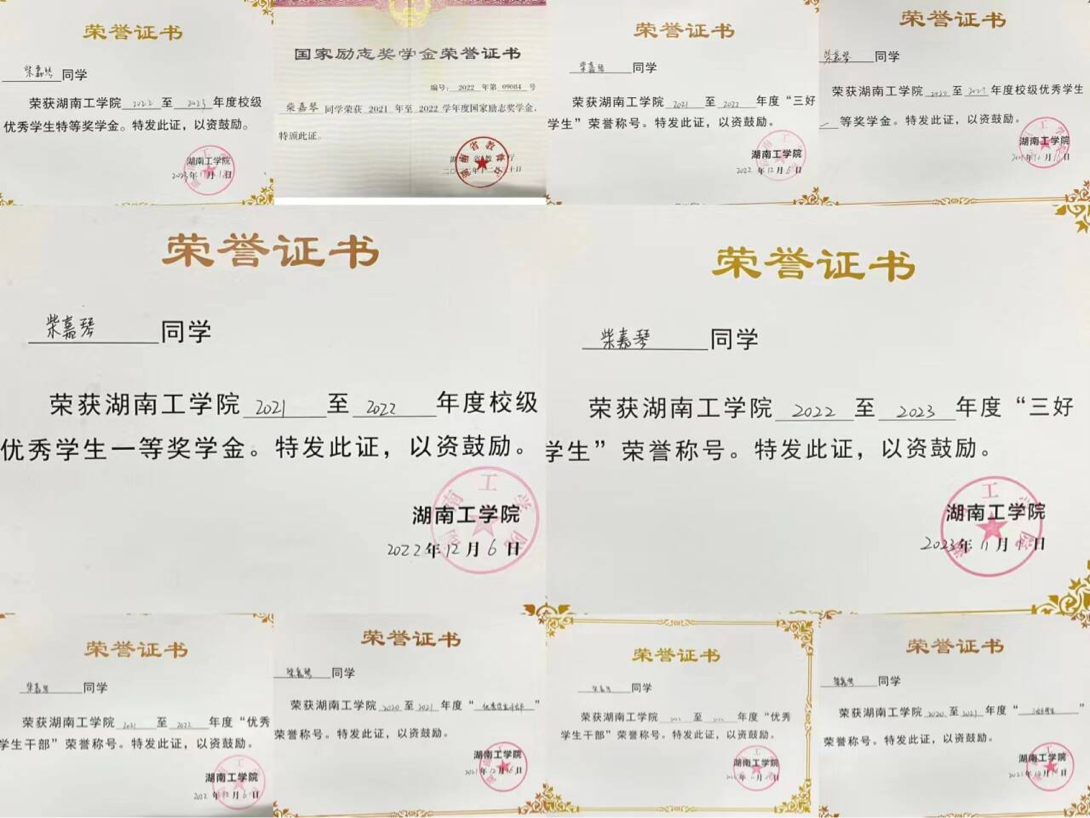 在校期间荣获国家励志奖学金1次、校级一等奖学金1次、校级优秀三好学生1次、校级优秀共青团员1次、优秀班干部1次,学习成绩排名第一,综合成绩排名专业第一。在校期间积极参加比赛活动,曾获得省级奖项荣誉1次、校级奖项荣誉6次。