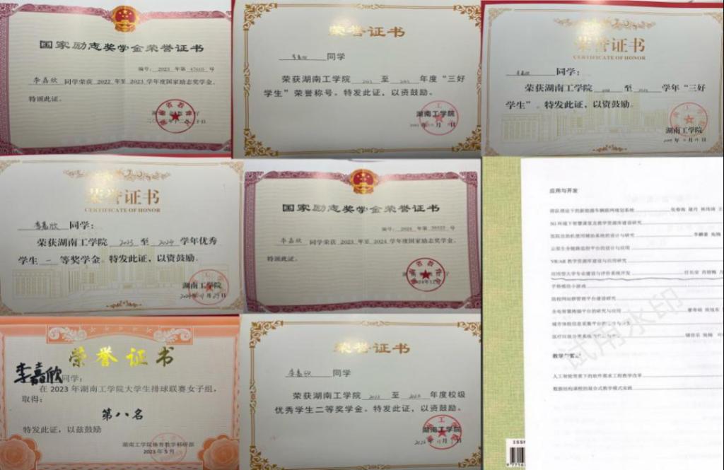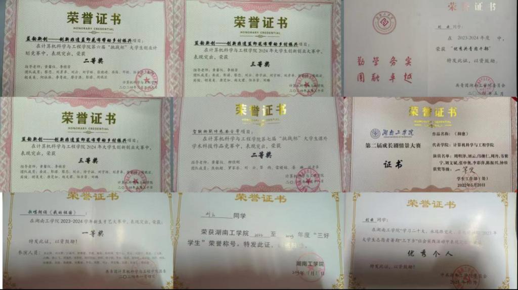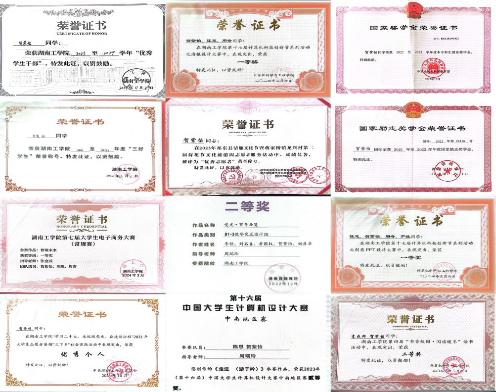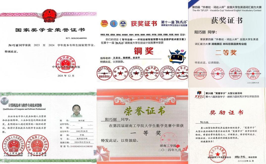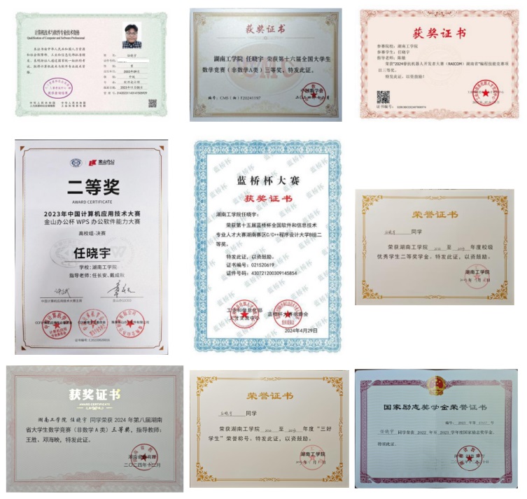 在校期间考取了软件设计师资格证书,荣获第十八届芙蓉学子榜样力量优秀大学生自强不息奖,国家奖学金1次,国家励志奖学金2次,校级二等奖学金2次,校级优秀三好学生2次,2023-2024学年平均文化成绩95.25,综合成绩排名专业第一。在校期间积极参加学科竞赛活动,曾获得国家级奖项荣誉1次,省级奖项荣誉2次,校级奖项荣誉10余次。
