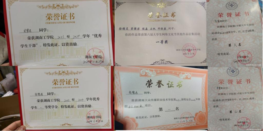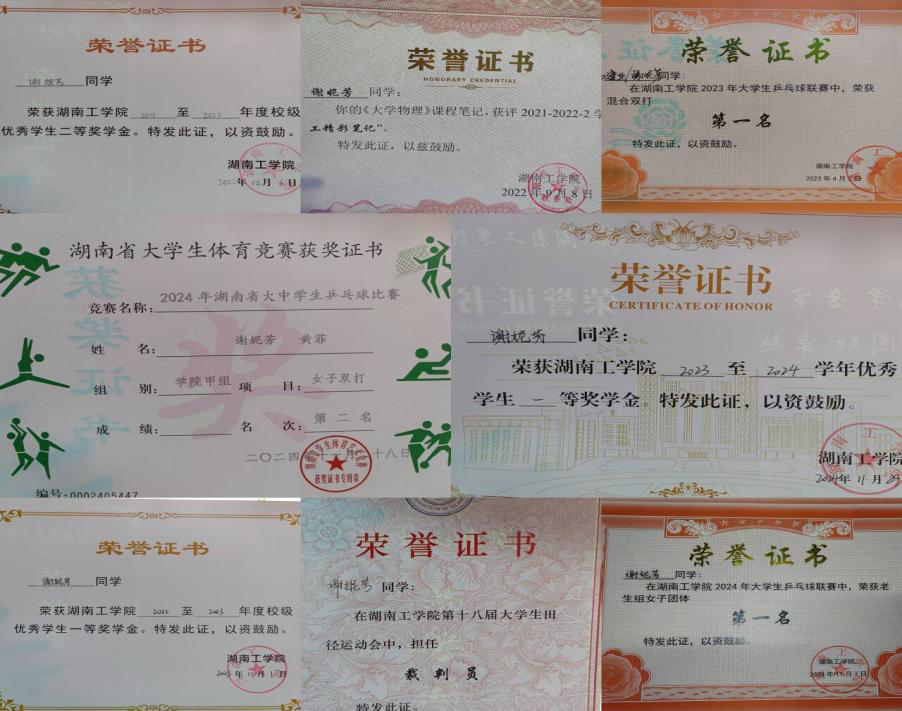 在校期间多次获得省、校级荣誉,获得校级一等奖学金2次、校级二等奖学金1次、优秀团员1次。在校期间积极参与各项比赛并获得奖项数余,曾参加湖南省大学生乒乓球比赛并获得第二名。