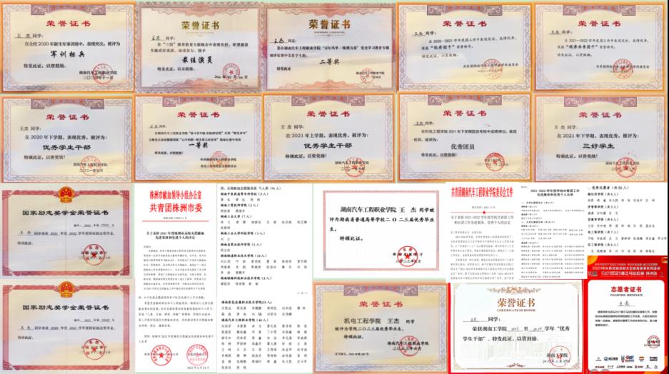 在校期间荣获国家奖学金、国家励志奖学金、校级一等奖学金;“优秀个人”、“先进个人”、“县优秀志愿者”等称号。