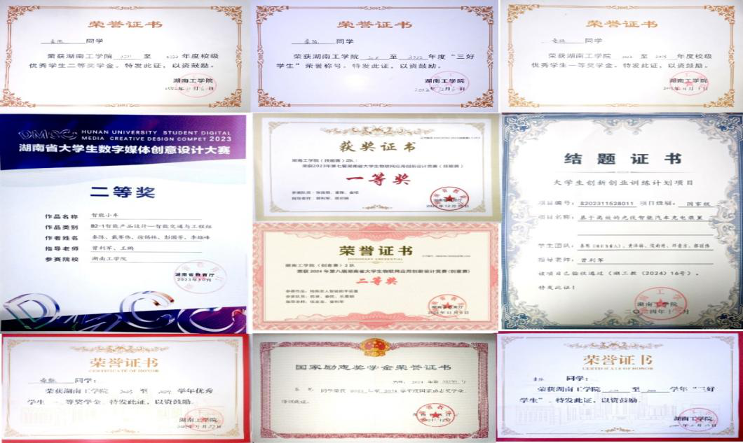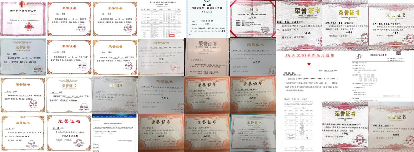 在校期间成绩优异,多次获得省、校级荣誉,荣获校级一等奖学金2次,校级二等奖学金1次,校级三好学生2次,国家励志奖学金1次。曾主持并结题一项国家级大创项目,获得湖南省第七届物联网竞赛省一等奖,湖南省第八届物联网竞赛省二等奖,湖南省数字媒体创意设计大赛省二等奖,中国大学生计算机设计大赛省三等奖,校级竞赛奖数余项。