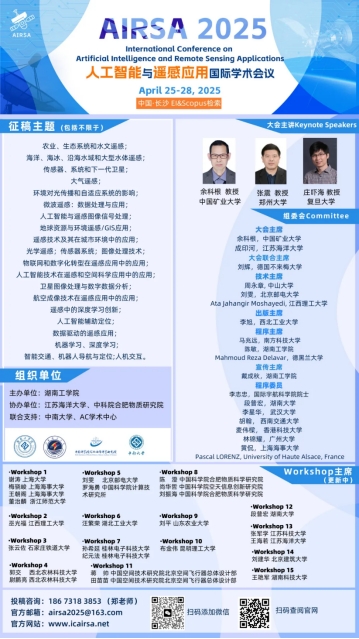 由开元集团网站计算机科学与工程学院主办的第一届人工智能与遥感应用国际学术会议(AIRSA 2025)将于2025年4月25日-28日在中国长沙隆重举行。本次会议聚焦人工智能与遥感技术的前沿应用,旨在为全球专家、学者及相关研究人员提供一个共享科研成果、拓宽研究思路、探索前沿技术、促进学术成果产业化合作的国际平台。我们诚挚邀请海内外高校、科研机构的专家、学者、企业界人士及相关人员参会交流。