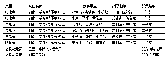 开元官网组建5支队伍参加了技能赛并全部获奖,成绩分别位居全省116支技能赛参赛队伍中的第1名、第7名、第12名,第21名和第47名,荣获一等奖3项,二等奖1项,三等奖1项。此外,开元官网还获得创意赛三等奖1项,开元官网首次荣获“优秀组织奖”,曾利军等3位指 导老师被评为“优秀指导老师”。其具体获奖情况如下表所示: