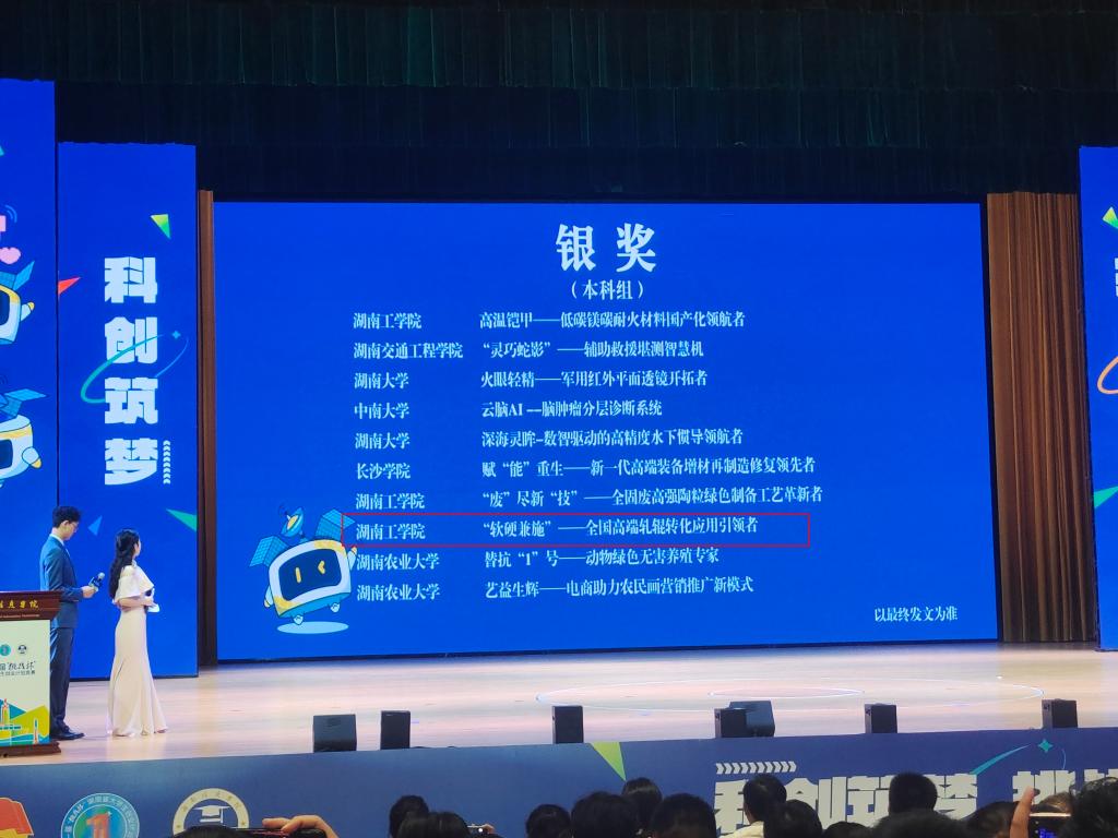 2024年6月21日至6月24日,由团省委、省教育厅、省人社厅、省科协、财信金控、省学联共同主办的第十一届“挑战杯”湖南省大学生创业计划竞赛终审决赛在长沙举行。来自中南大学、湖南大学、湖南师范大学等全省80多所高校共247个项目进行了激烈角逐,经过专家学者、行业领军人物、知名企业家担任赛事评委的评审,我院学生团队从中脱颖而出,其中“软硬兼施——全国高端轧辊转化应用引领者”荣获银奖。