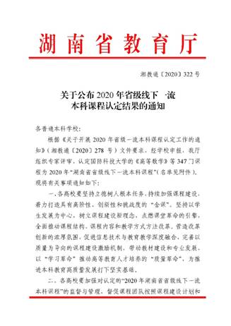 近日,湖南省教育厅发布了《关于公布2020年省级线下一流本科课程认定结果的通知》(湘教通[2020] 322号,见附件),开元官网推荐省级的7门课程顺利通过认定,现将通知转发,请各教学单位注意查收。
