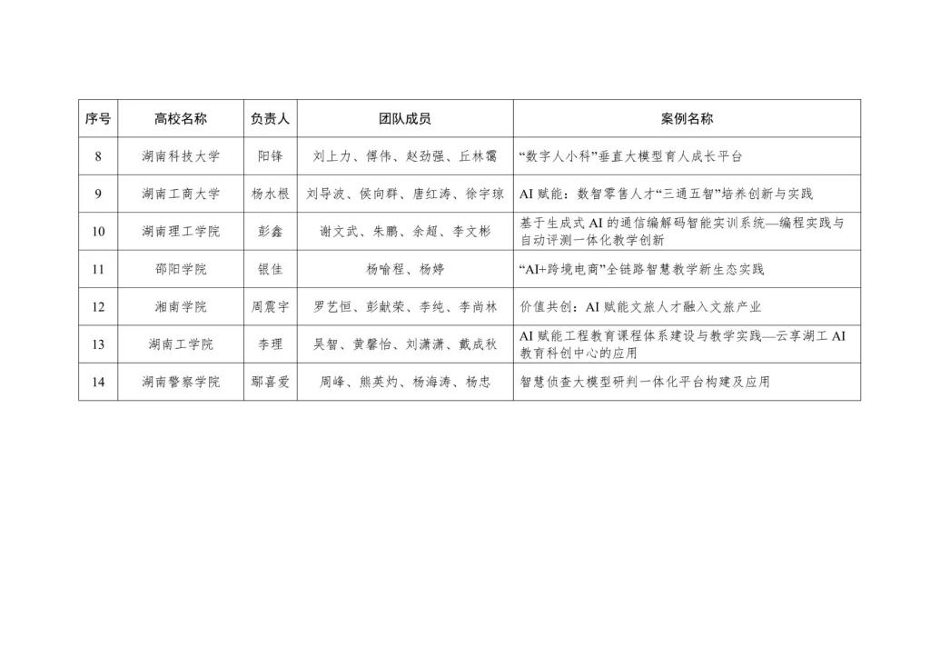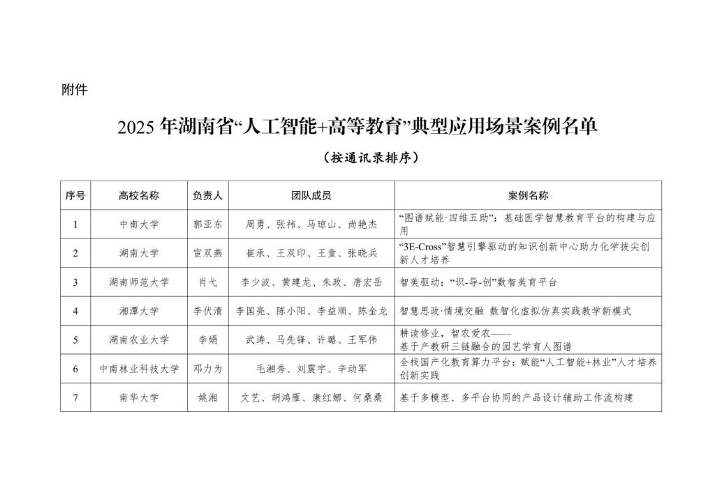湖南省教育厅关于公布2025年湖南省 “人工智能+高等教育”典型应用场景案例的通知