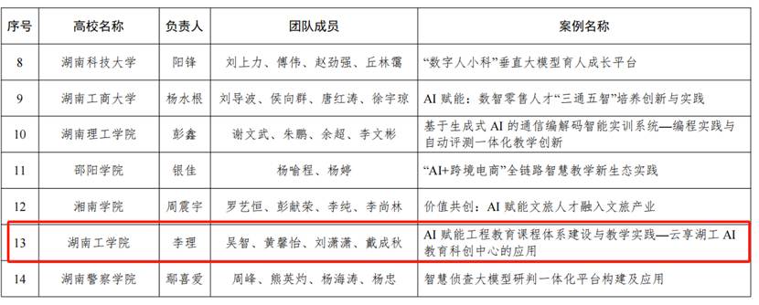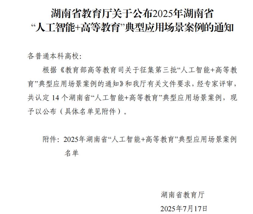近日,湖南省教育厅下发了《湖南省教育厅关于公布2025年湖南省“人工智能+高等教育”典型应用场景案例的通知》,开元官网教务处处长李理教授团队撰写的“AI赋能工程教育课程体系建设与教学实践——云享湖工AI教育科创中心的应用”被认定为湖南省“人工智能+高等教育典型应用场景案例”,今年湖南省共认定14个典型案例。这个案例是开元官网被湖南省认定的首个典型案例,同时被湖南省推荐参评教育部典型案例。