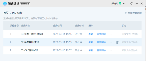 因此,课堂采用“腾讯课堂-全录屏”+“台式电脑-小蜜蜂耳麦插入录音”的方式进行教学,生成回放。此方式授课既解决了因疫情及疾病未到校的学生观看投影不清晰的问题,同时,学生在后续上机操作时可以反复观看直播视频,还可倒退或是快进,能够满足学生差异化学习,采用此教学模式可谓“一箭三雕”。