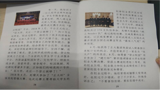 我院成型卓越 1501 班的龙啸天同学,于 201 9 3 月和合作伙伴共同建立了“登云校园”平台。虽然在成长的过程中出现了各种各样的问题。但是在双创学院和机械工程学院老师的共同扶植下,“登云校园”平台得以蓬勃发展。龙啸天同学的优秀创业案例多次在重大的创业大赛中荣获佳绩,为我们机械工程学院提供了很好的榜样作用。龙同学的事迹也被双创学院收录为校优秀创业典型。4月24,我院以他为典型案列,邀请其在 4209 与各年级优秀代表及其部分大四毕业生代表举行一个零距离的座谈会,大家相互学习,会议气氛相当融洽。