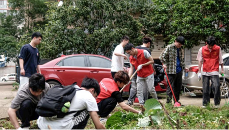 合影结束后,所有同学都去亲身参与实践劳动,学生杨雨洁说:“小区里边边角角的地方杂物很多,有的还挡了路。我和几个同学一起动手,把这些杂物都收拾得干干净净的。虽然干得很累,但一想到以后小区的居民们走路都方便了,我就觉得特别开心。”
