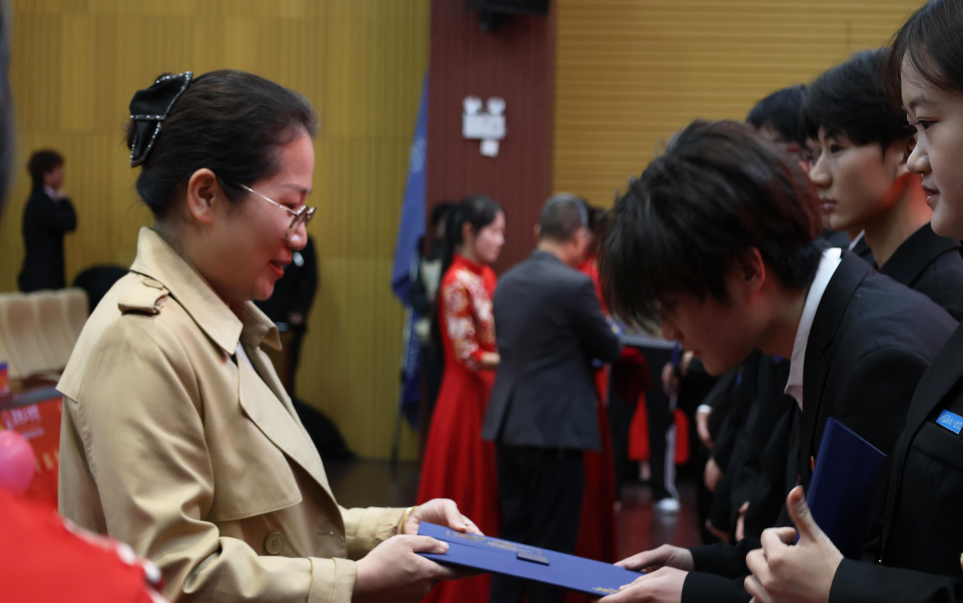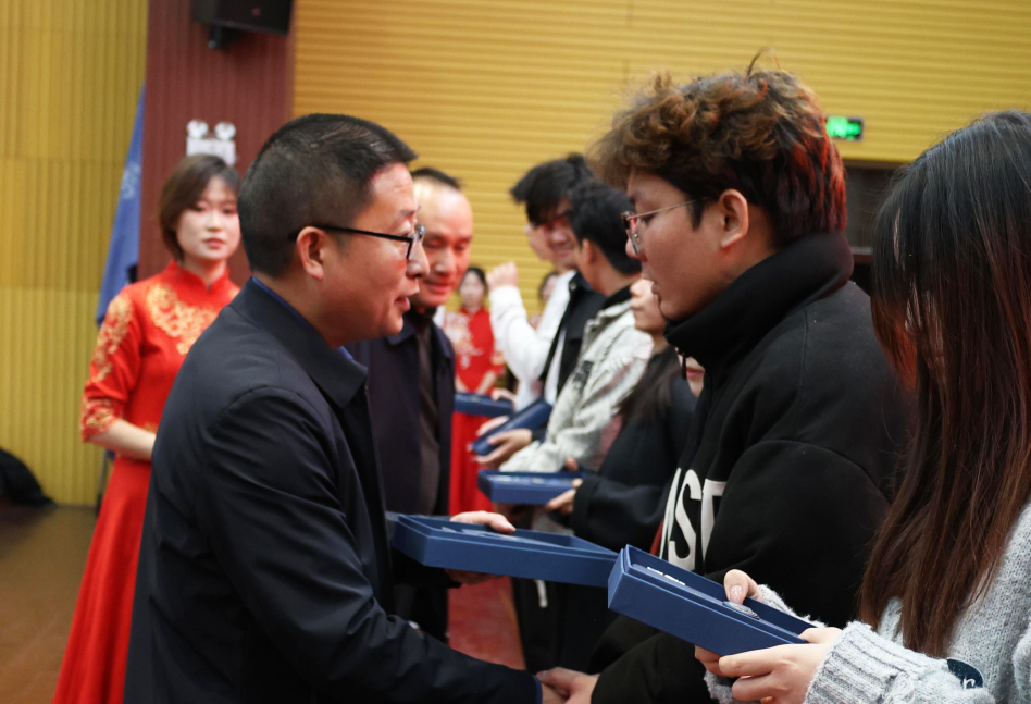 刘斌、李天生为第十七届团委学生会干部颁发纪念品。党委副书记王本强宣读了第十八届团委学生会干部的任命决定。在热烈的掌声中,学院领导为新一届学生干部颁发了聘书。