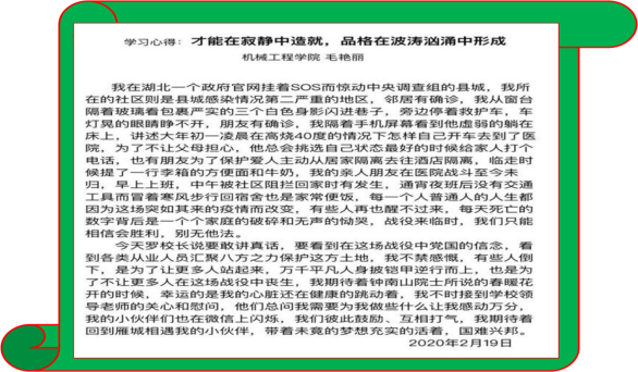 我院全体师生、部分家长、校友及关心湖工发展的同仁观看了直播课程,课后,师生反响热烈,纷纷结合自身工作学习实际,谈感受,谈触动,谈希望。