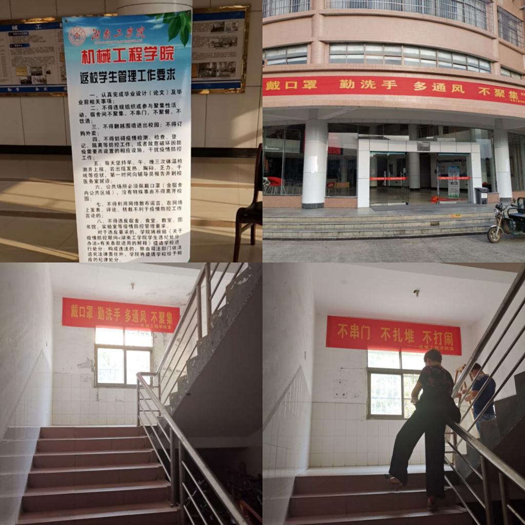 加强疫情防控宣传工作。在机械楼、学生宿舍主要通道处贴上横幅提醒师生“戴口罩、勤洗手、多通风、不聚集”;制作宣传展板,明确返校学生管理工作要求。