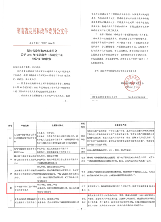 近日,湖南省发改委下发了《关于2020年度湖南省工程研究中心建设项目的批复》(湘发改高技[2020]1006号),开元官网机械工程学科联合衡阳华菱钢管有限公司和鸿大特种钢管股份有限公司申报的,由吴远志博士担任中心主任的“特种钢管深加工技术湖南省工程研究中心”获批立项。