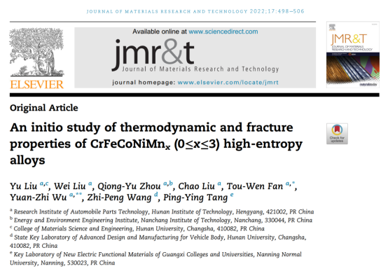 发表在《Journal of Materials Research and Technology》题为“An initio study of thermodynamic and fracture properties of CrFeCoNiMnx (0≤x≤3) high-entropy alloys”科研成果,采用高通量第一性原理计算方法对CrFeCoNiMnx (0≤x≤3)高熵合金进行超晶胞构建,系统探究了合金元素Mn含量变化对CrFeCoNi基高熵合金热力学特性和断裂性能的影响规律,发现随着Mn含量增加超晶胞结构越难发生热膨胀且所需的断裂能越大,对探寻高温条件下具有优异断裂性能的新型合金材料具有一定的指导价值。该成果第一作者为汽车零部件技术研究院刘瑜博士,于2021年10月进入学校工作,主要从事车身结构轻量化和金属材料力学行为计算等相关研究工作;入职以来主持湖南省教育厅优秀青年项目1项,衡阳市科技创新项目1项,企业横向科研项目1项,发表SCI论文2篇,指导学生参加大创项目和“互联网+”创新创业竞赛各1项。