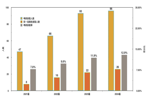 佳绩的取得离不开考研学子的不懈努力,也是学院高度重视学风建设,不断提高人才培养质量的结果。近年来,学院多措并举狠抓学风建设,营造浓厚考研氛围,实施了一系列助力考研的举措,毕业生考研率、上线率、录取率逐年攀升。一是加强考研动员,树立考研典型,引导学生做好学习生涯规划,确立考研志向;二是狠抓学风建设,通过建设学习型班级和学习型宿舍,引导学生养成自主学习的优良习惯;三是优化考研服务,通过学业辅导、心理疏导和复试指导等,帮助更多的同学实现考研升学梦想。四是推进教学改革,夯实理论基础,提升学生解决复杂工程问题能力。