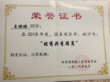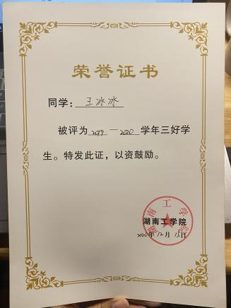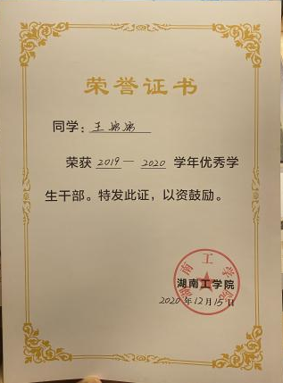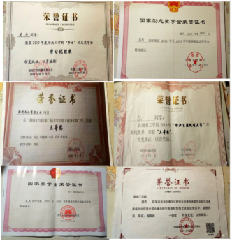 在校期间,连续两年专业成绩第一,整个大学生涯绩点专业第一,顺利通过英语四六级,获国家奖学金一次,国家励志奖学金两次,校一等奖学金两次,校友学习标兵奖学金,校级三好学生两次,校级优秀学生干部一次,湖南省优秀共青团干部,以及优秀工作者若干。