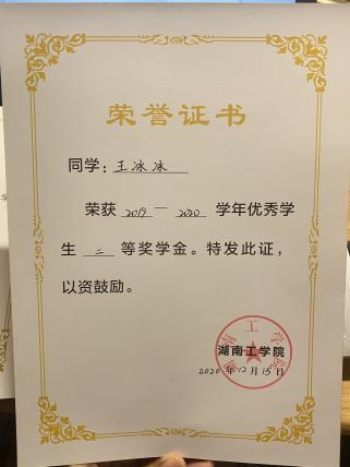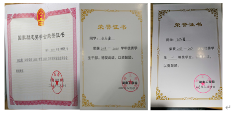 在校期间荣获国家励志奖学金2次、校级一等奖学金1次、校级二等奖学金1次、校三好学生1次、校优秀学生干部1次、校优秀团员干部1次、校优秀共青团员1次。