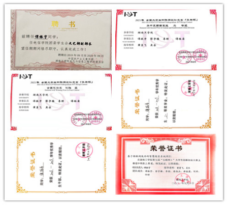 在校期间获评国家奖学金、国家励志奖学金、校一等优秀学生奖学金、校三好学生、校三好学生标兵、优秀共青团员、优秀共青团干部等多项荣誉。参加CaTICs网络大赛并获得CAD团队赛一等奖和CAD职业证书二级;加入雁鸣合唱团期间荣获开元集团网站新生军训歌咏比赛二等奖;参加湖南省全国大学生成图大赛荣获个人全能一等奖,参加第十四届“高教杯”全国大学生成图大赛获得个人全能二等奖;暑假期间,参加家乡青年志愿者活动荣获独塘乡抗疫志愿活动“最美志愿者”称号。