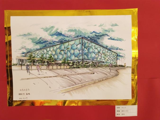 因为兴趣所向,唐瑶同学在课余时间参加了许多学校或是学院组织的各类活动。如在建党100周年书画展上,她绘制了两幅画来表达自己对祖国的美好祝福。其中一幅是2008年北京奥运会的“水立方”,另一幅是“故宫·春”“故宫·秋”。