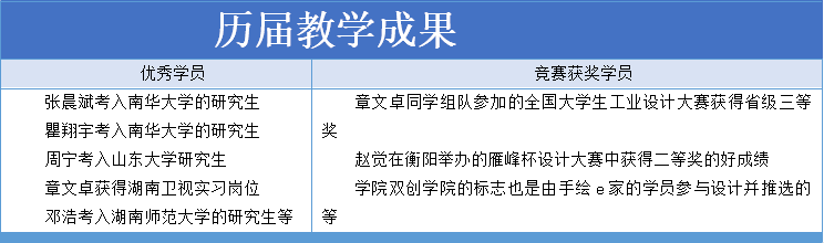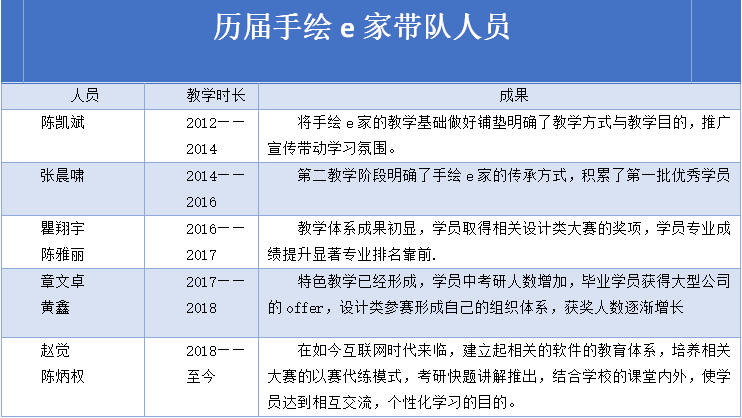 该项目为传承制度,当这届的学长教学结束后会推选下届的学生继续担任教育教学工作,推选的学生必须为老师认可,平时专业成绩优秀,且接受过相关活动培训的学生,这样在降低费用,保证质量的同时也能能节约资源。七年来手绘e家更是一种自强不息的文化精神的传承,每一届带队教师不同教学风格也各有差异唯独不变的是其良好的口碑,在历届手绘班的成员中综合毕业就业率达到百分之九十。