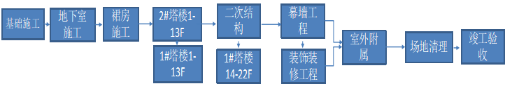 本工程进度计划采用流水施工,结合施工组织设计排班,按实际的施工工序,合理安排施工时间,逻辑关系明确明了。根据后浇带划分施工区域组织流水,分别为A、B、C、D,E加上1号楼一共六个区域。工期定额通过工期优化由618天优化为555天。