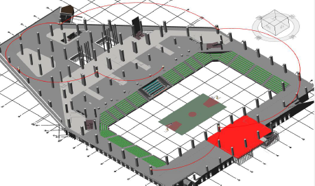 在建立体育馆模型之后,编制进度计划时间的基础上,将施工工序的工期与模型构件依次关联起来,沙盘模拟可以实际记录本工程现场的施工状况以及施工工序,对比实际进度和计划进度之间的出入,现场施工人员更方便效率的做出相应的调整。
