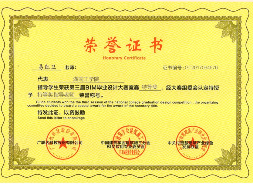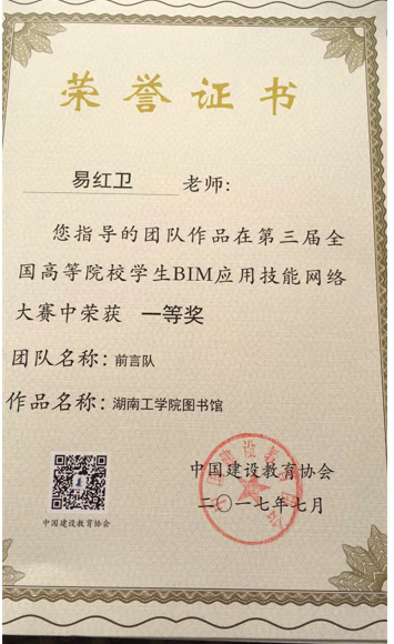 第三届全国高等院校学生BIM 应用技能网络大赛一等奖 |