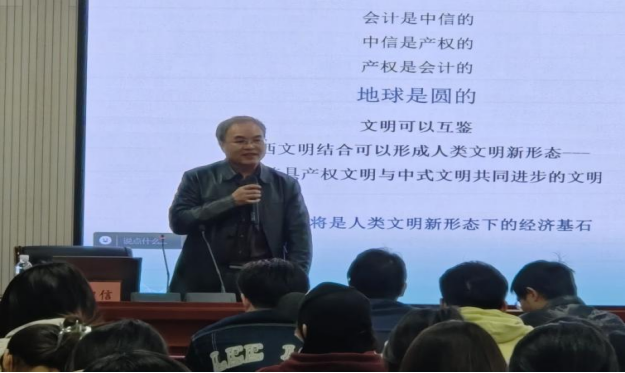 伍中信教授以其深厚的文化功底、严谨的会计思维,深入浅出地向师生们诠释了会计的初心。他的讲座充满哲思又妙趣横生,既有会计人的理性客观,又有文化人的厚重典雅,向在场师生缓缓打开产权会计之门。伍教授与大家共同探讨了“什么是最初的初心”这个问题。他认为,马克思主义中国化、时代化的唯一途径,就是与中国传统相结合,具体就是要同中国具体实际相结合、同中国优秀传统文化相结合。他利用阴与阳、虚与实相关理论,提出了国学的财务学思想:股权 (实) +债权(虚)。产权与会计是阳和阴的哲学关系,没有会计,人类产权文明无从谈起;会计文明是产权文明,是国际商业语言,是世界文明,是世界产权文明。