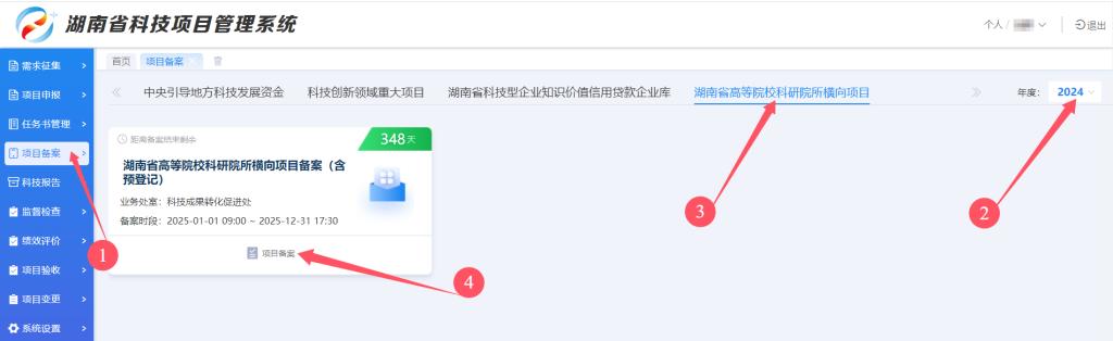 2025年度项目备案按照《湖南省高等院校科研院所横向科研项目备案工作操作指引》时间节点进行,系统常年开放,省科技厅每年5月和10月分两批次集中受理备案材料。